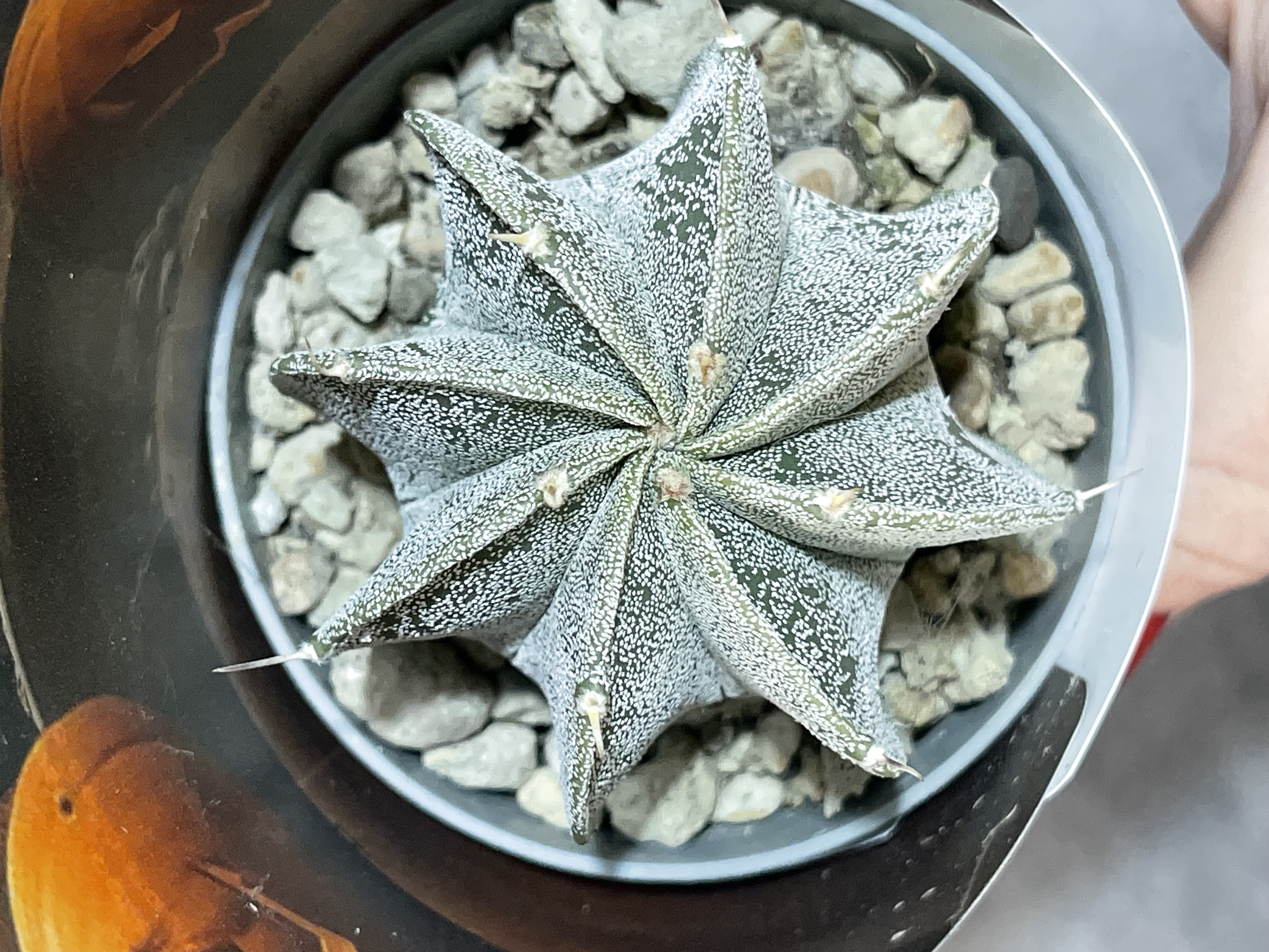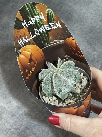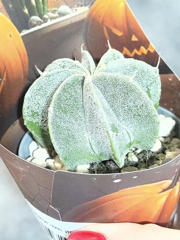 Шаровидный крапчатый кактус в форме совершенной звезды с 7 шикарными ребрами. Многочисленные пятнышки на самом деле пучки ворсинок, Астрофитум лишен колючек. Житель пустынь со знойным и засушливым климатом. Его пепельно-зеленого окраса стебель удлиняется по мере роста. Во время непродолжительного цветения верхушку стебля украшают яркие воронкообразные цветы, похожие на ромашки. Этот период приходится на весну или начало лета.