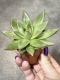 Компактный куст образован мясистыми листьями зеленой окраски со скромной красной окантовкой. На продолговатых заостренных пластинах заметно глянцевое напыление. Симметричные шарообразные розетки немного напоминают кувшинки.