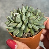 Распускающийся «каменный цветок» из единственной изящной розетки экзотического суккулента. Светло-зеленые листовые пластины немного вогнуты внутрь. Красноватые верхушки и продольные полосы на обратной стороне эффектно выделяются на общем зеленом фоне листьев. Вы можете заметить их легкую ворсистость. Плотность пластин объясняется высокой напитанностью влагой.