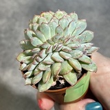 Малышка с заявкой на всеобщее признание. Разрастается многочисленными боковыми побегами, образуя розетки из зелено-голубых листьев. Форма плотных листовых пластин привычна для Эхеверий: вытянутая с заостренным кончиком. Характерная розовая окантовка листочков гармонично разбавляет общий фон.